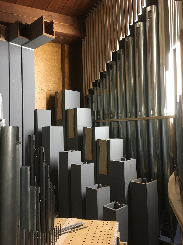SOMIERI: Sono presenti 18 somieri: Grand’organo note pari, Grand’organo note dispari, Espressivo note pari, Espressivo note dispari, Contrabasso 1 – 12, Basso 8’ 1 – 32, Ance GO e Ped., Acute Ance GO, Principale 8’ in facciata, 2 per Flauto 8’ in facciata, Violone Ped., Subbasso 16’ Ped., Bordone 8’ Ped., 2 per Principalino – Oboe 8’, Flauto 2’, Acute Bordone 8’ OE.